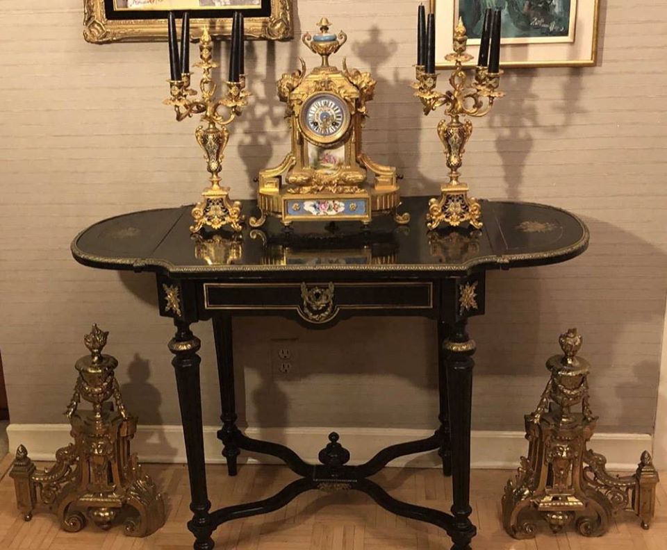 Pendule ancienne et paire de candélabres. Argent ancien. Cabinet antique Curio avec bronze doré. Porcelaine antique porcelaine anglaise, française et européenne. Chaises d’occasio antiques. Console anglaise antique laquée noire avec monture en bronze doré. Table d’appoint en marbre antique. Table basse antique. Chenets antiques. Jardinière en porcelaine antique.