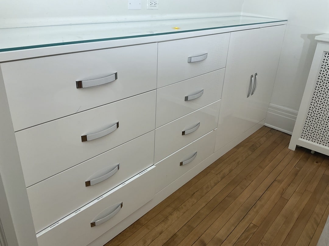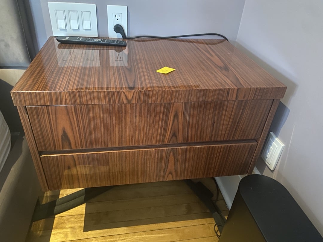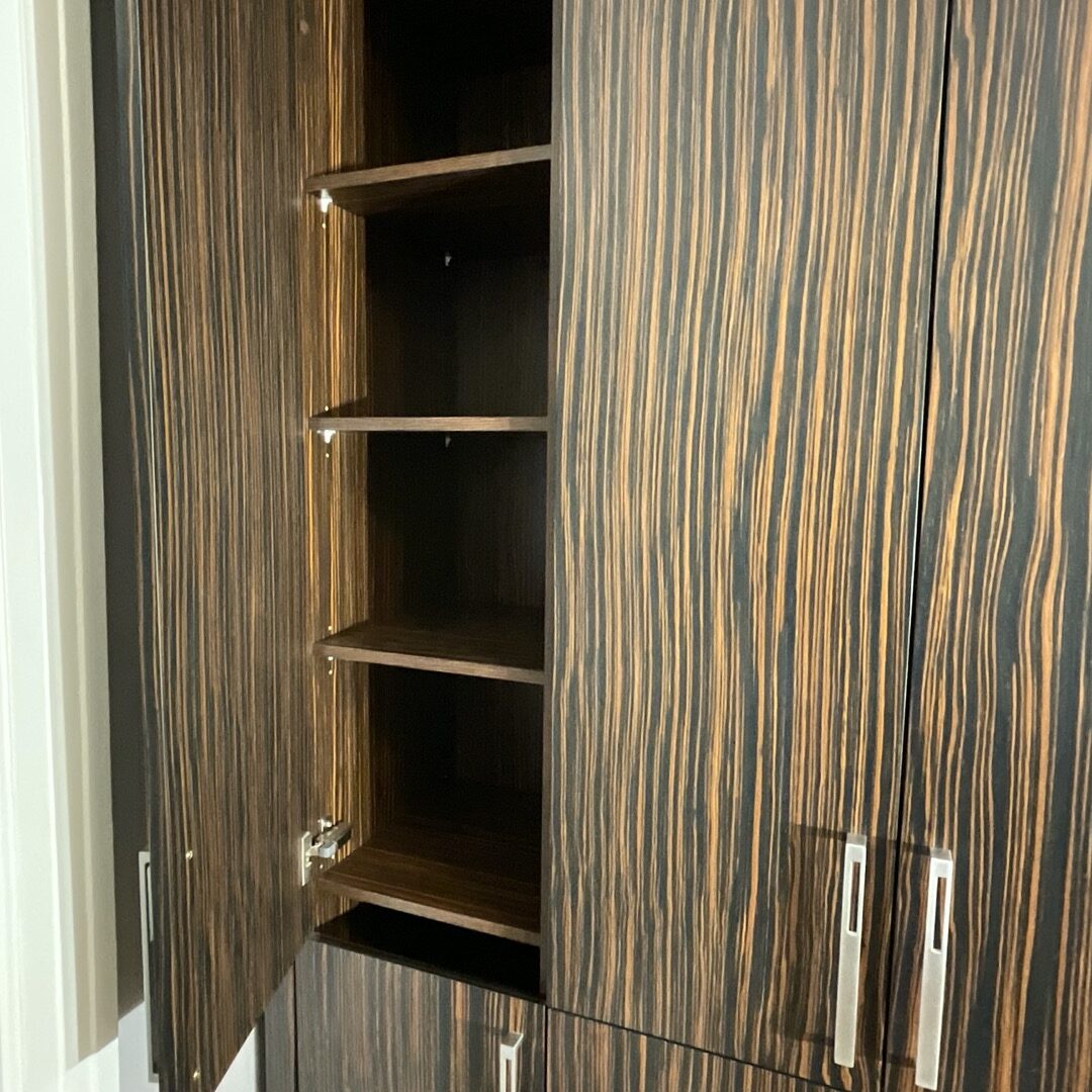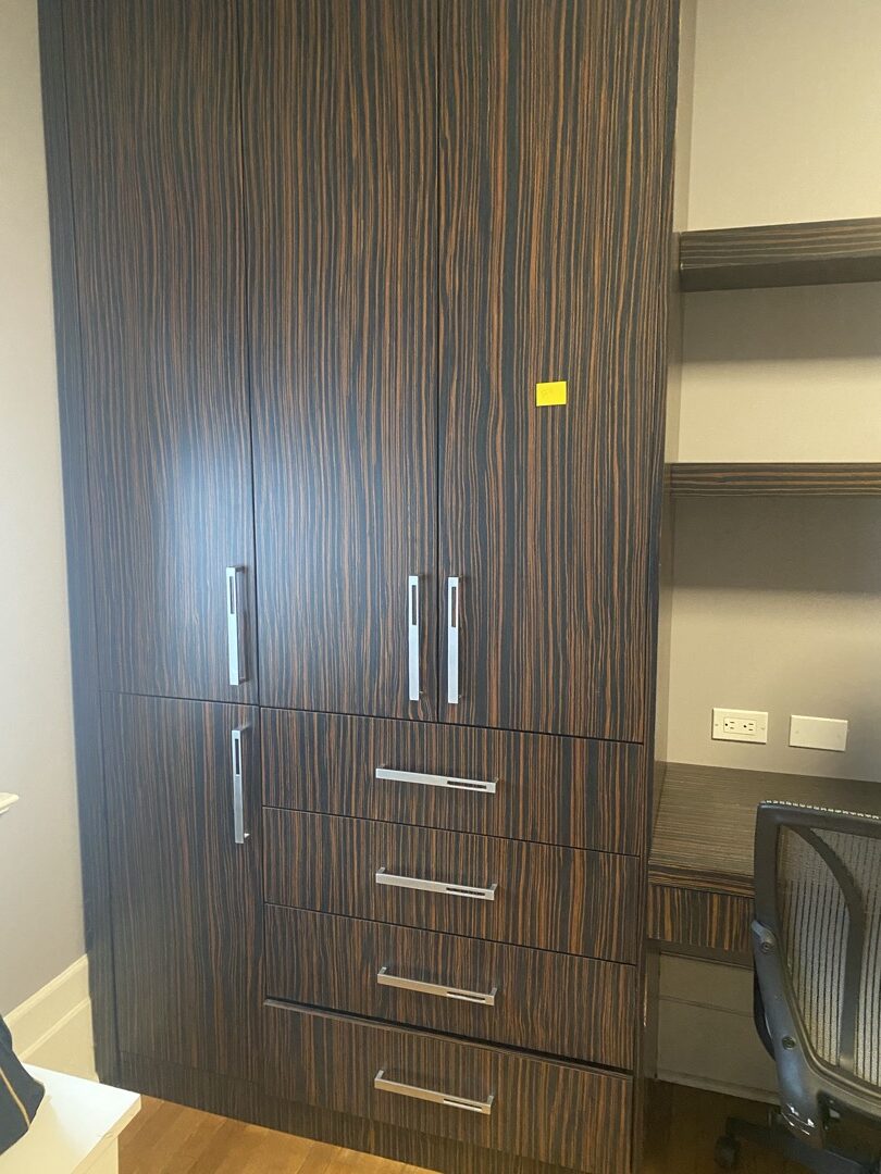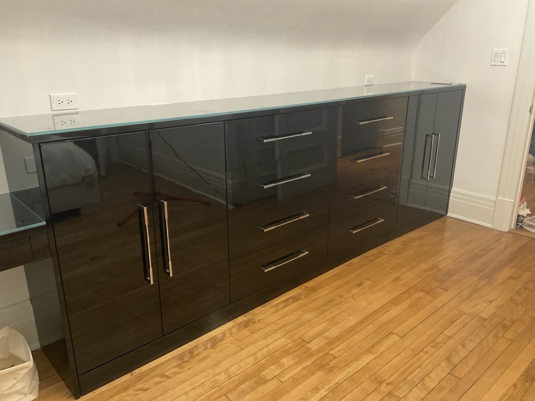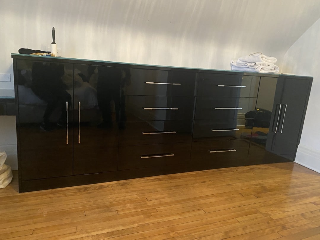 Veuillez noter que certains meubles sont de magnifiques encastrés qui peuvent être démontés. Veuillez apporter vos outils. Parmi les encastrés, on compte les deux grandes penderies, les tables de nuit en bois zébré, les têtes de lit, ainsi que deux grandes commodes — l’une noire et l’autre blanche.
