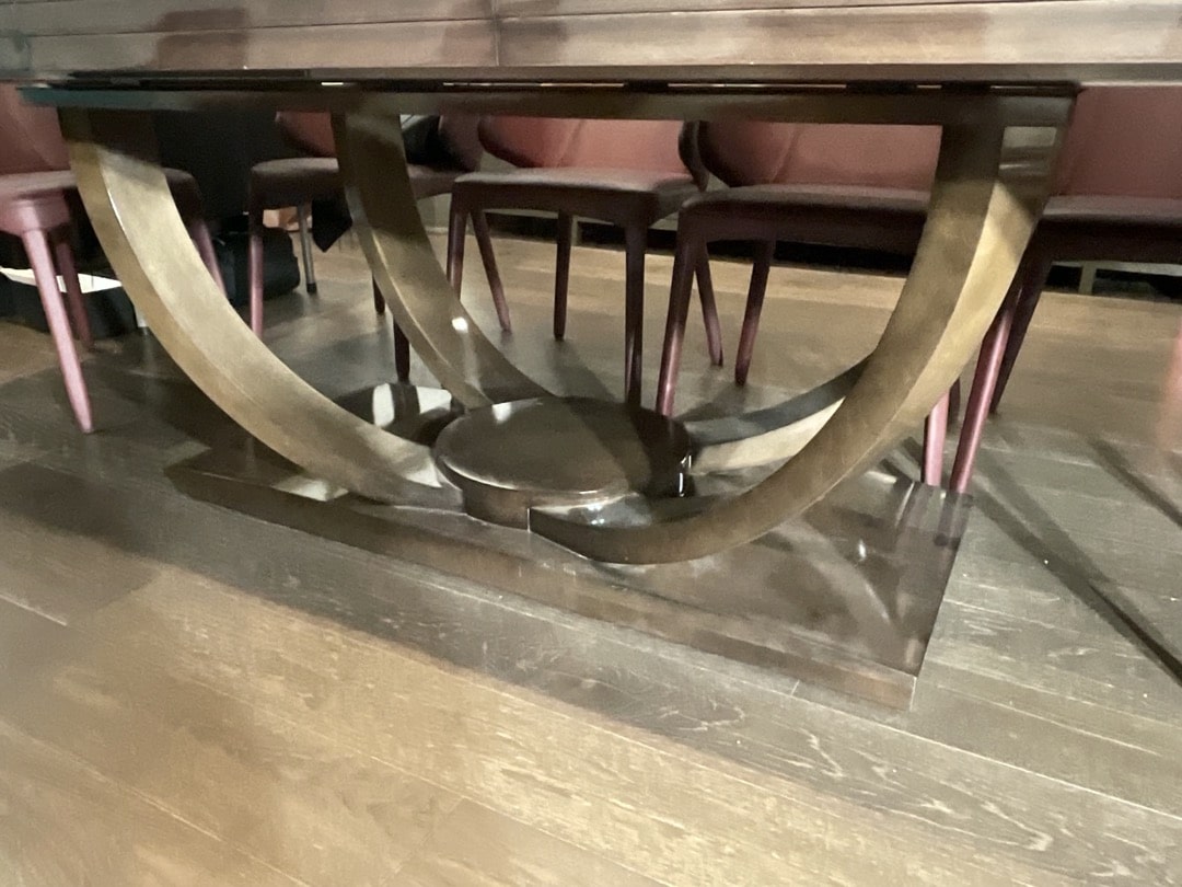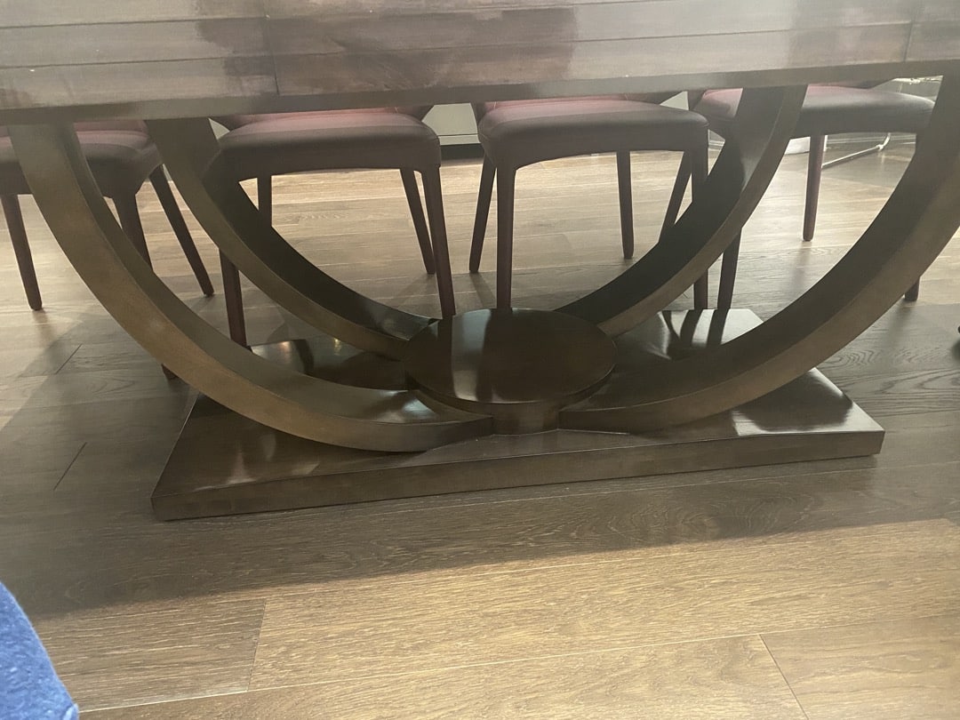 Superbe table de salle à manger moderne en noyer laqué avec base sculpturale