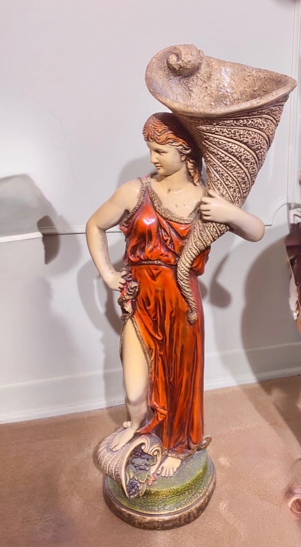 The sculpture is made of polychrome vitrified hard-paste porcelain and is entirely decorated by hand. It depicts a female figure, carrying a large cornucopia-like vessel over her shoulder