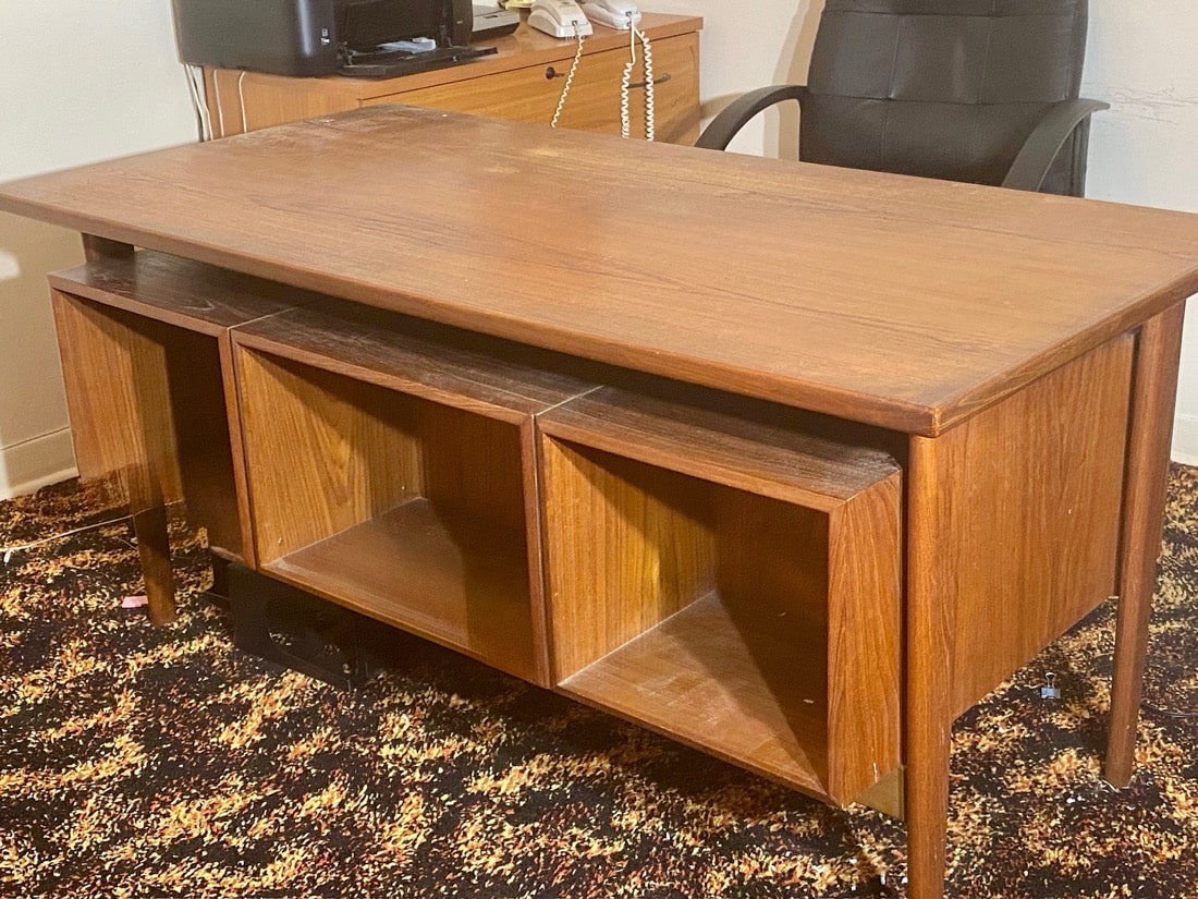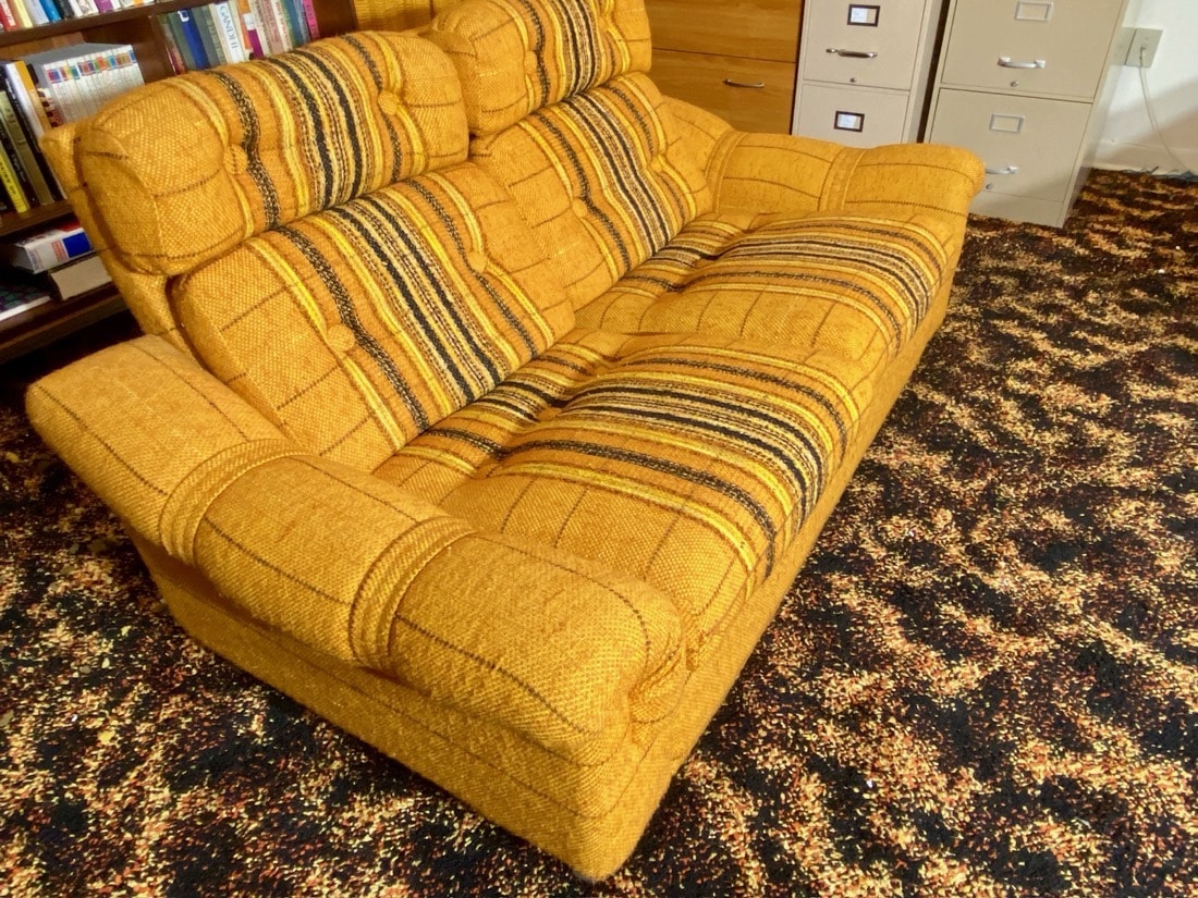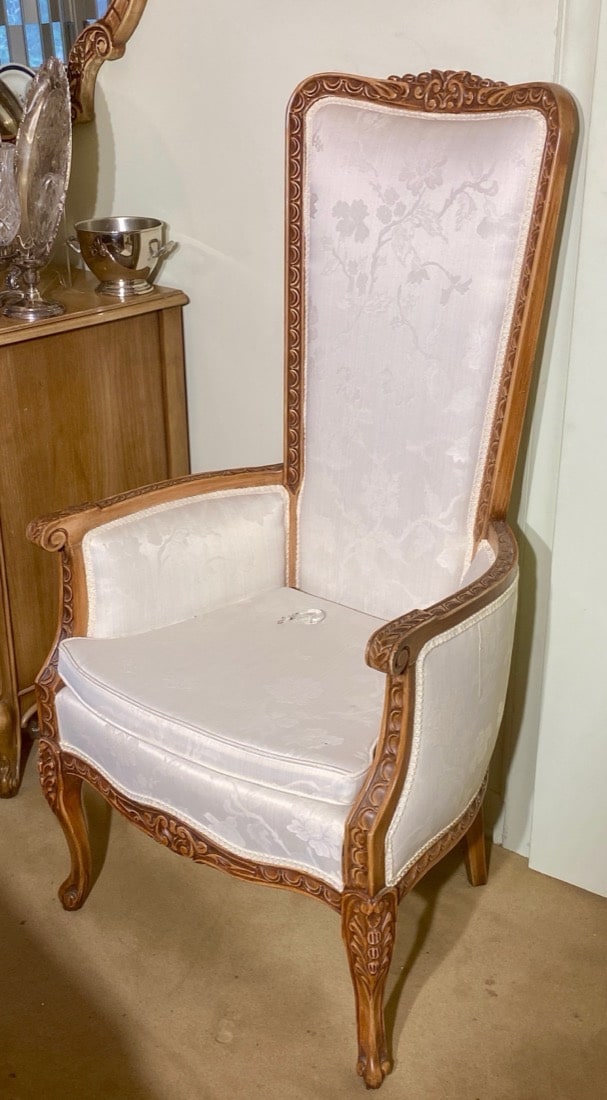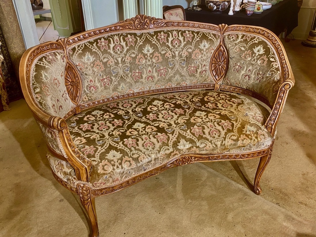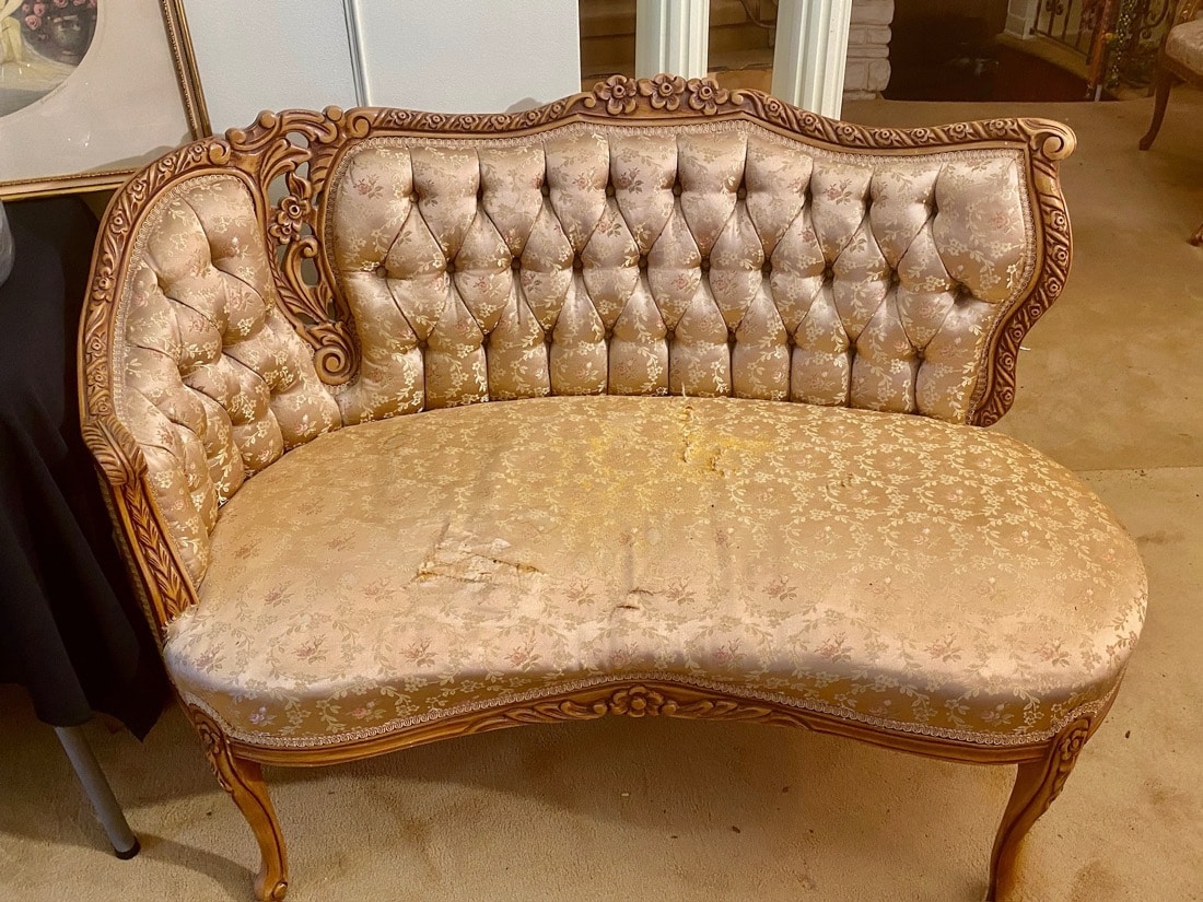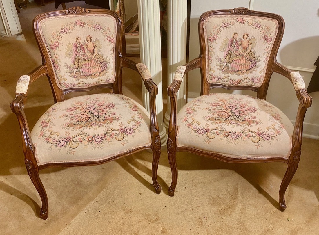Danish teak chairs, other chairs, desk, tables; side and coffee, wall unit. Pair of vintage French Louis XV style armchairs with pink tapestry upholstery featuring a pastoral scene. Louis XV style settee, master bedroom set. 1960’s striped sofa, Display units,