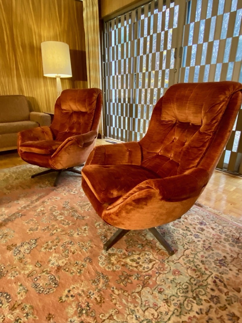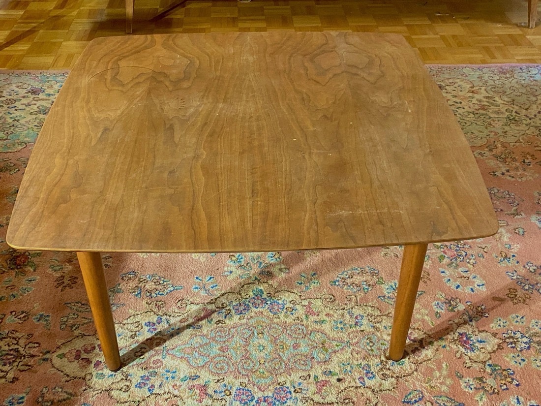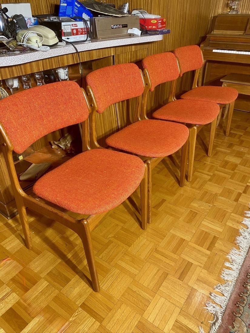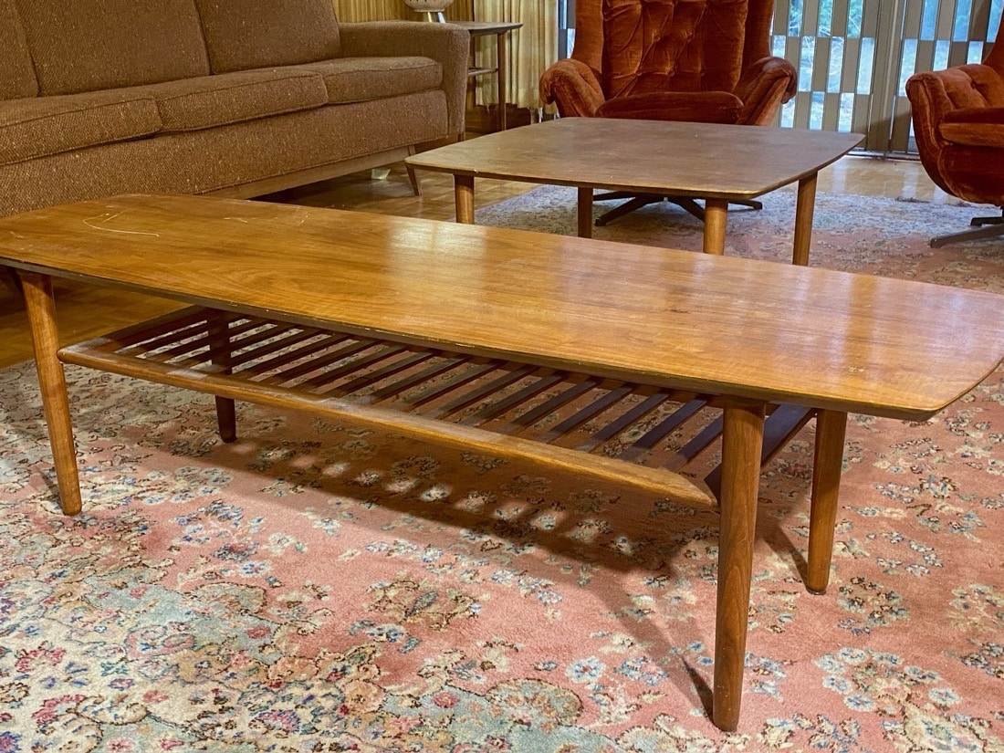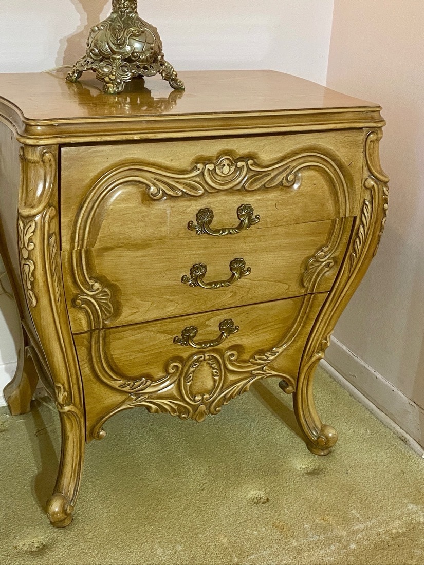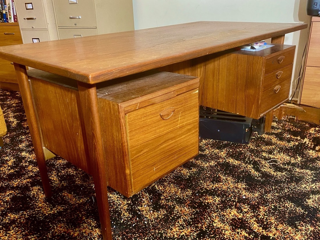 Danish teak chairs, other chairs, desk, tables; side and coffee, wall unit. Pair of vintage French Louis XV style armchairs with pink tapestry upholstery featuring a pastoral scene. Louis XV style settee, master bedroom set. 1960’s striped sofa, Display units,