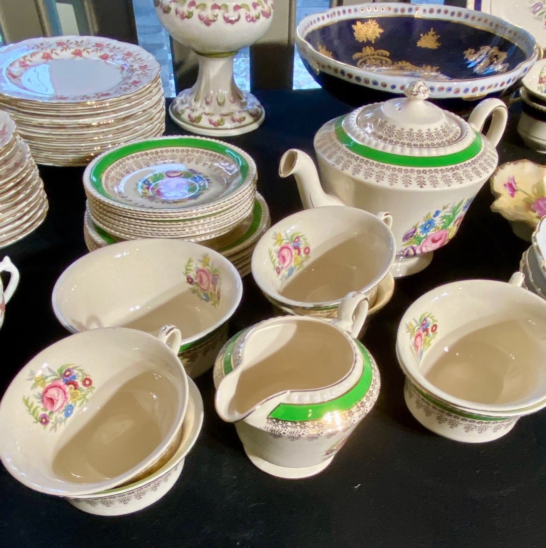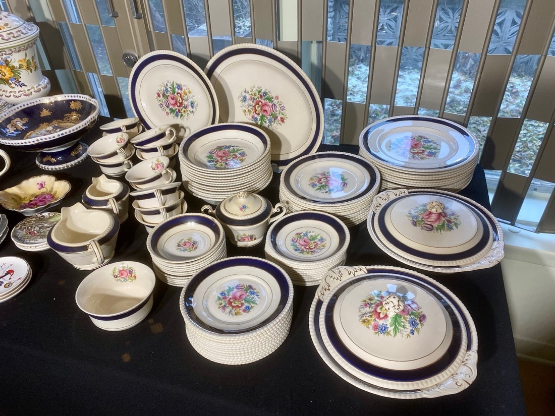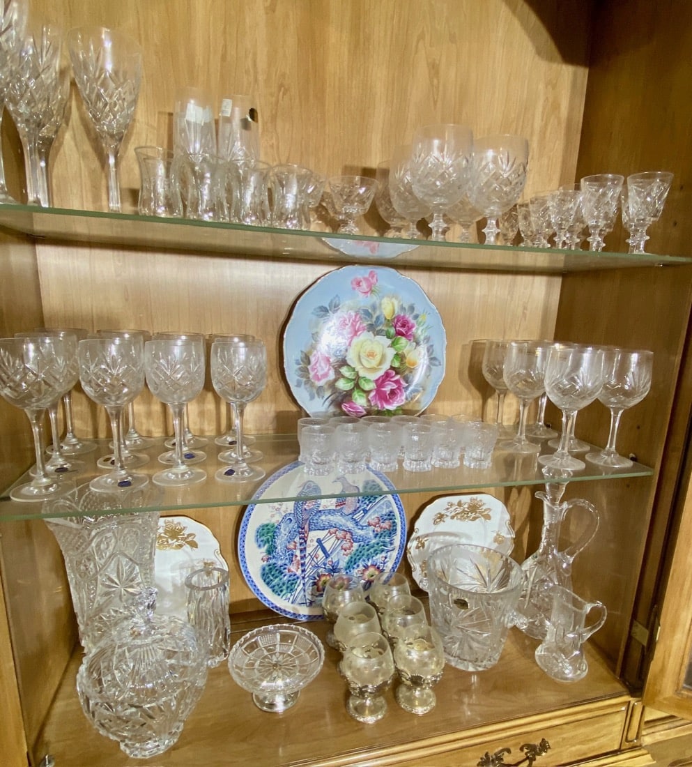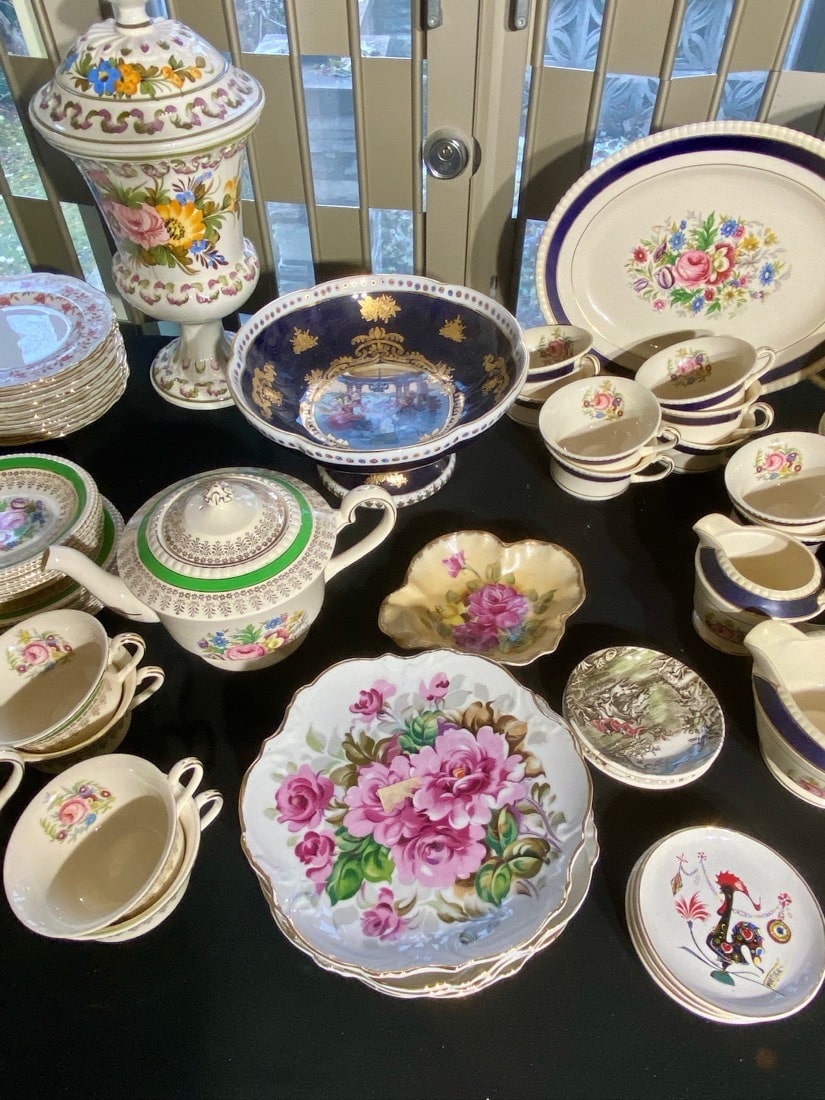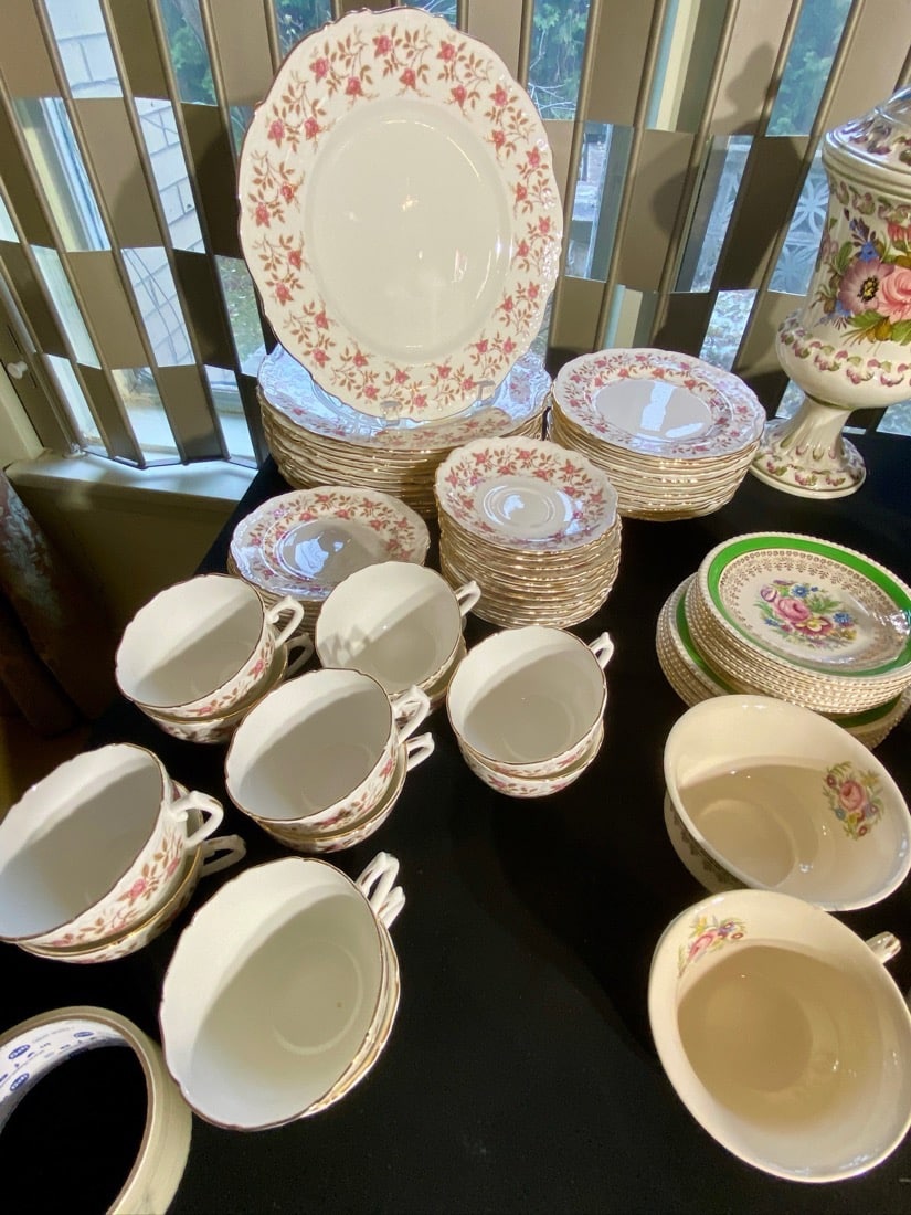 Vintage china sets; Foley “Enchantment” (scalloped edge), Solian ware, “Argyle”, Royal Ascot, “Cardinal”, “ Heathcote” bone china, and others. Crystal stemware and serving pieces…