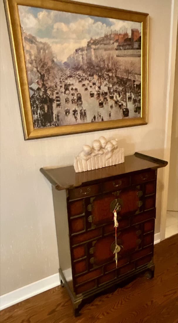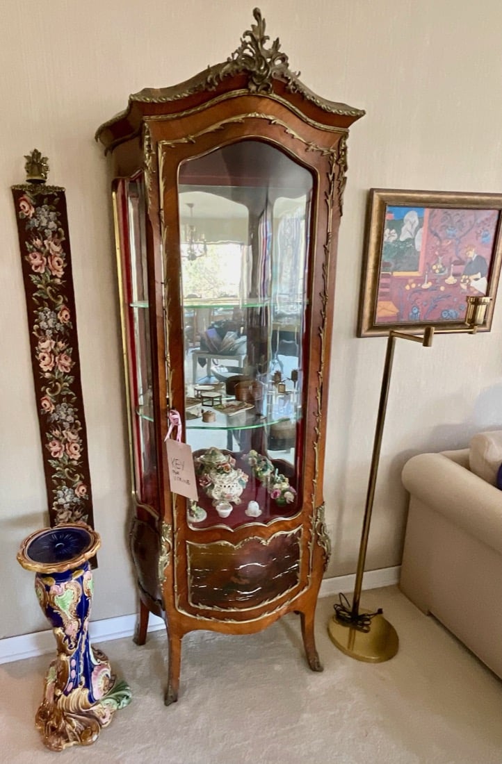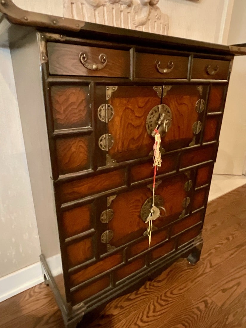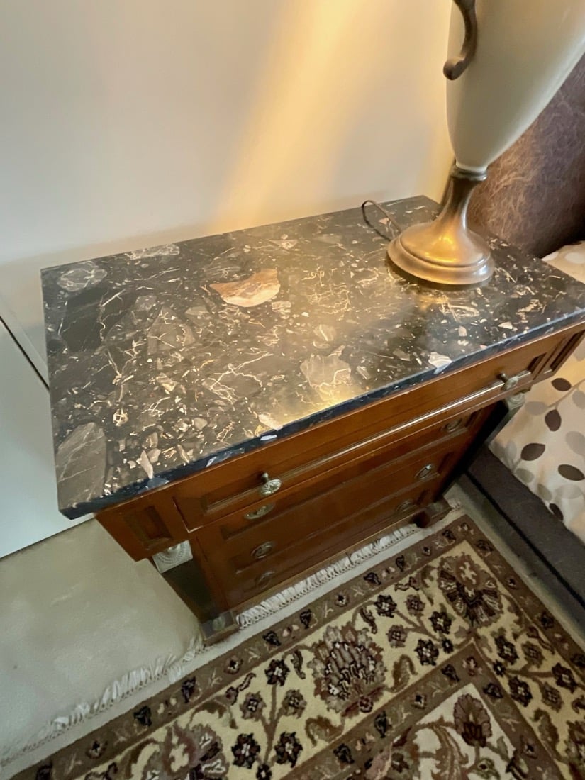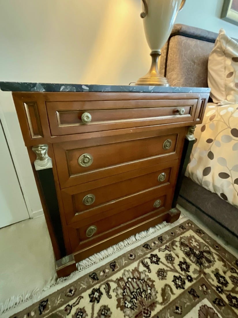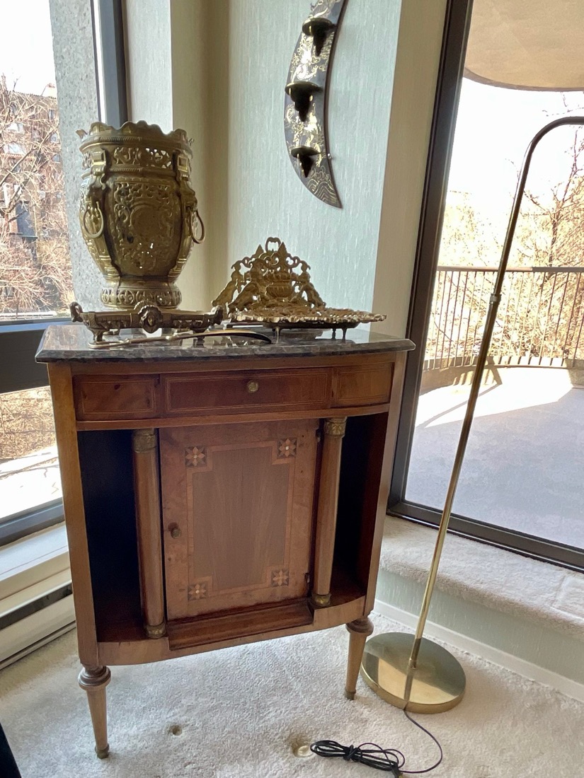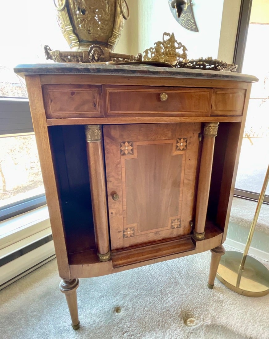 French Empire style marble top bedside cabinet featuring a single drawer and marquetry inlay on the door. . Vintage Korean Tansu or Bandaji style wooden chest cabinet featuring burl wood panels and brass hardware. Antique pine chest, Antique doll size pine box. Giacometti style knot table Wrought Iron & glass Knot Coffee Table, Maison Jensen style metal marble plant stand, Beidermeier style side table, French Louis XV style curio display cabinet, French, Canadian ladder back rustic wooden chair. Vintage 1950’s iron bistro or “ice cream parlor” set.