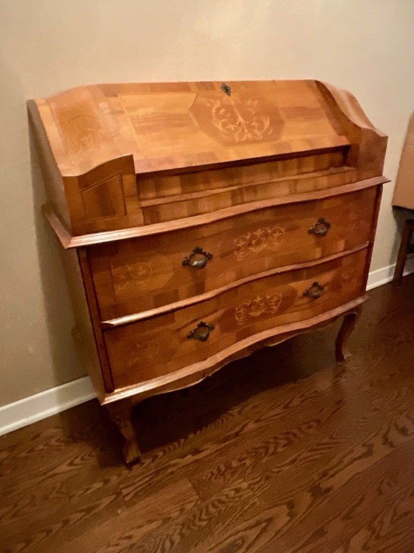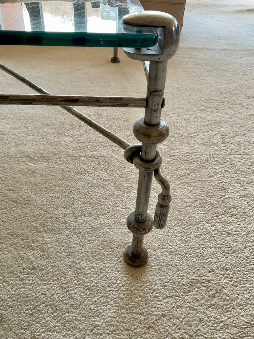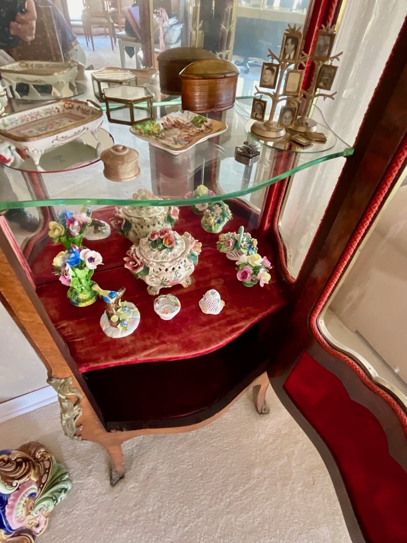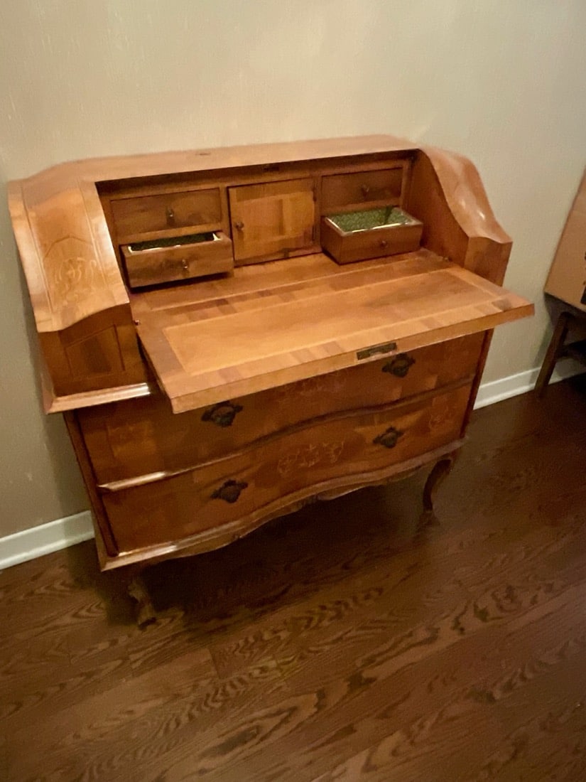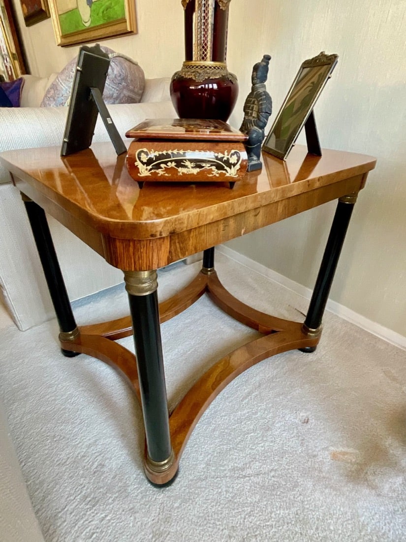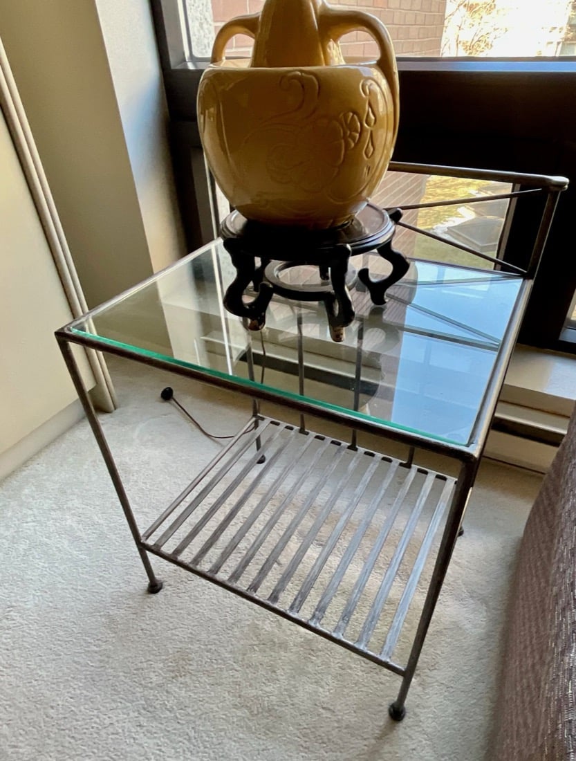 French Empire style marble top bedside cabinet featuring a single drawer and marquetry inlay on the door. . Vintage Korean Tansu or Bandaji style wooden chest cabinet featuring burl wood panels and brass hardware. Antique pine chest, Antique doll size pine box. Giacometti style knot table Wrought Iron & glass Knot Coffee Table, Maison Jensen style metal marble plant stand, Beidermeier style side table, French Louis XV style curio display cabinet, French, Canadian ladder back rustic wooden chair. Vintage 1950’s iron bistro or “ice cream parlor” set.