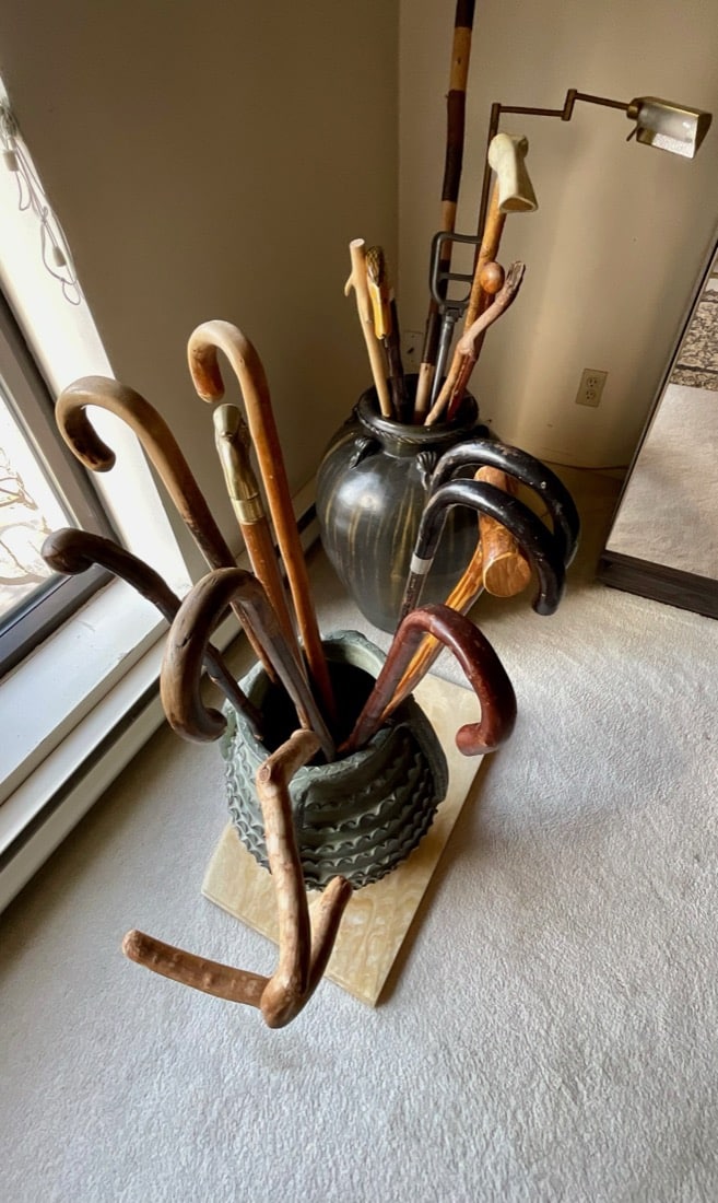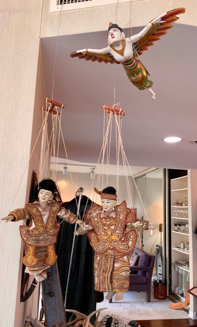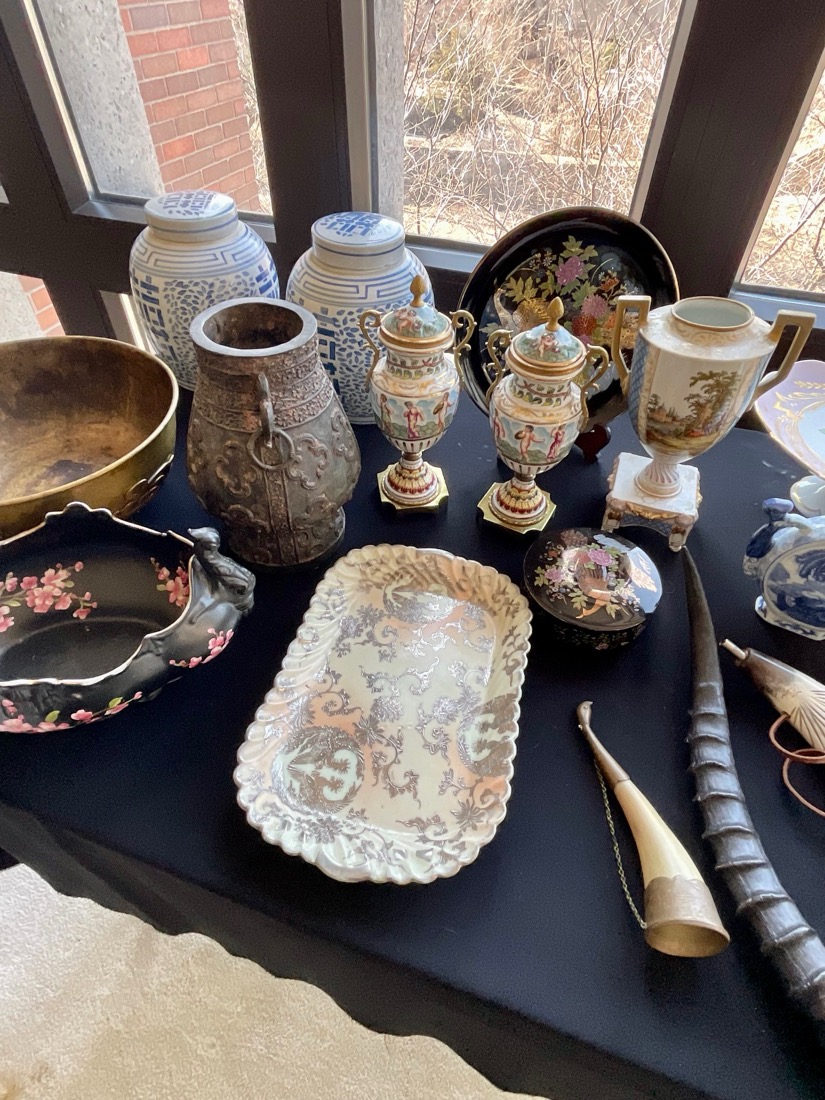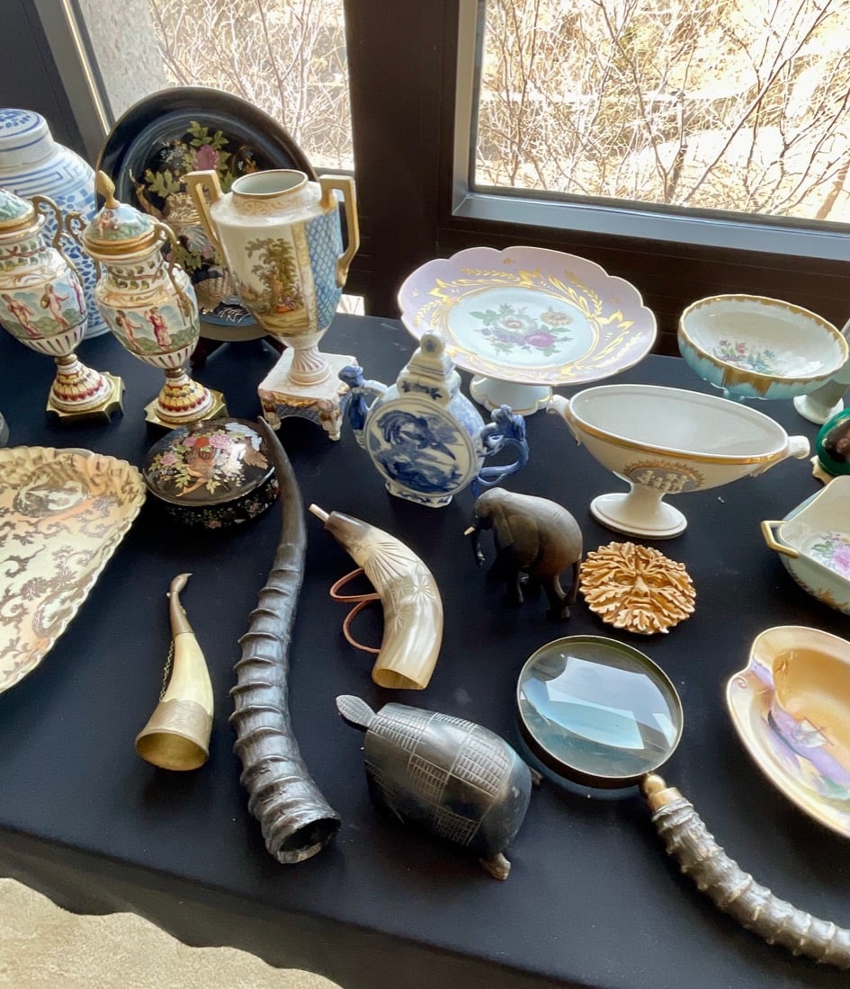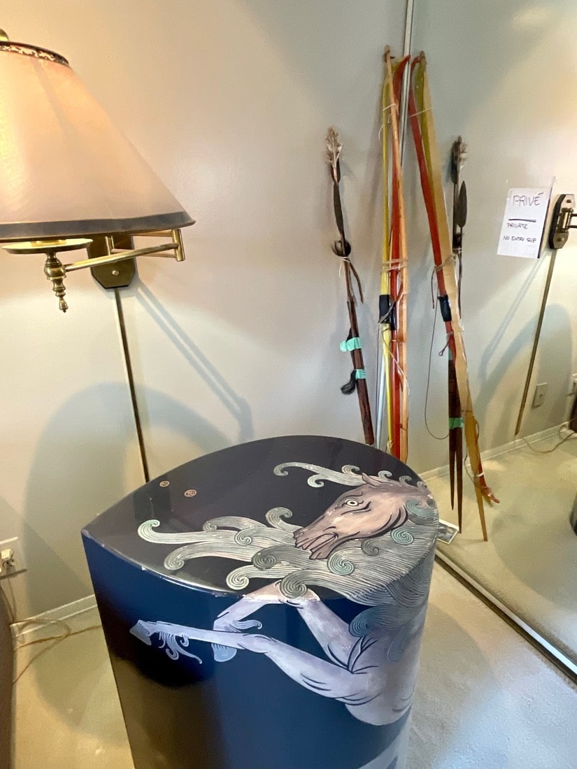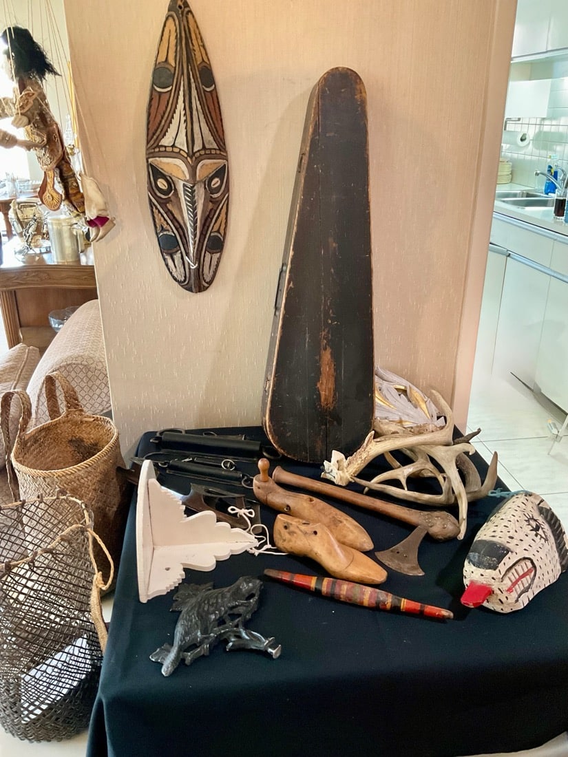 Antique wooden violin case, vintage antlers, antiques bows and arrows, antique scales, antique steel skates, antique shoe Molds, Kenyan Maasai spears, vintage Amazon baskets,