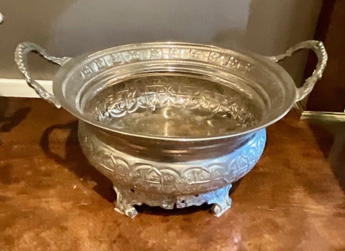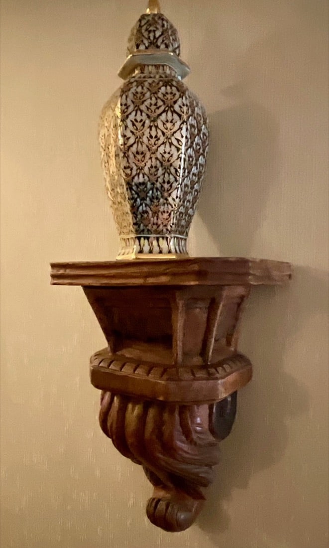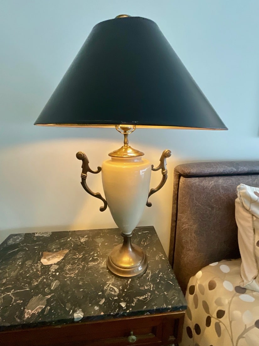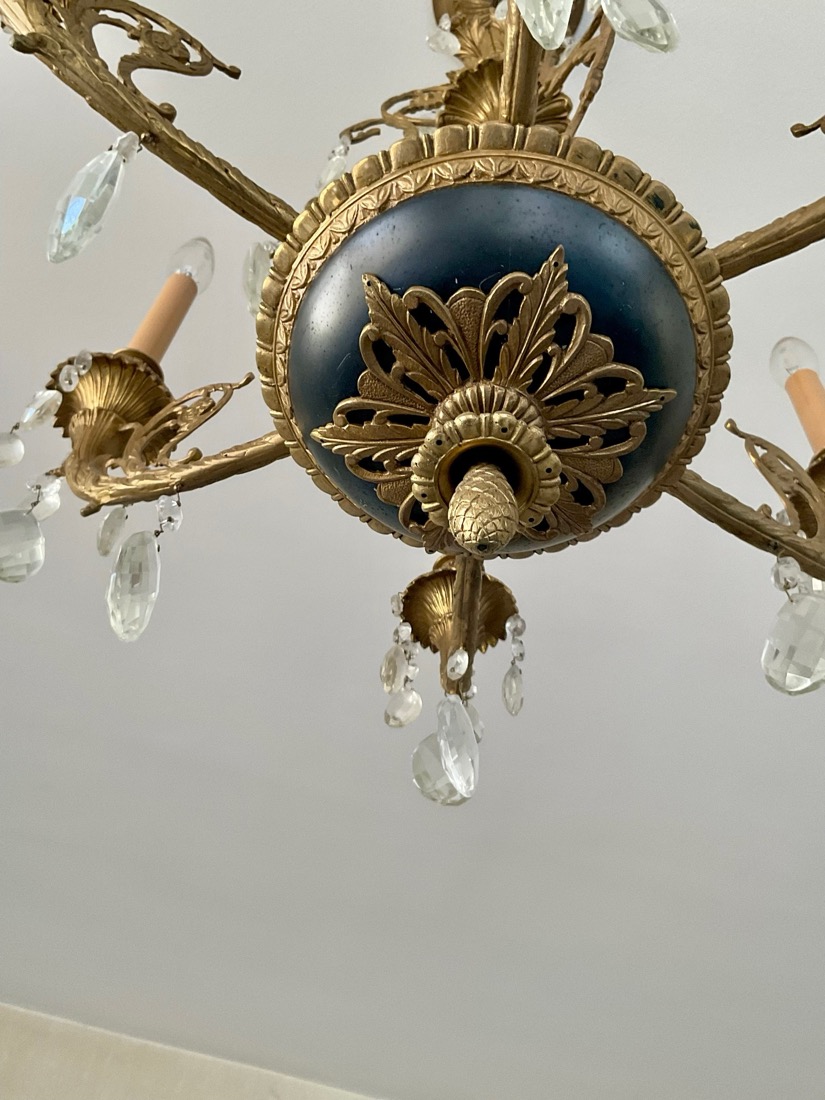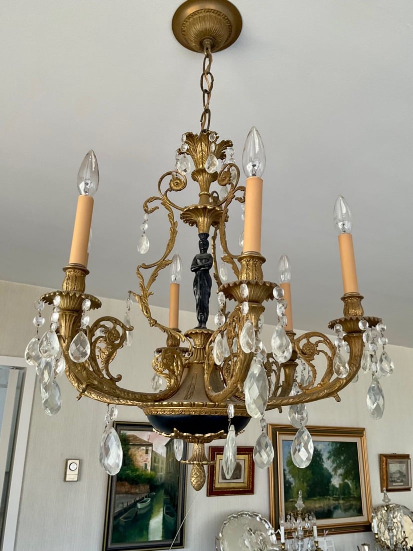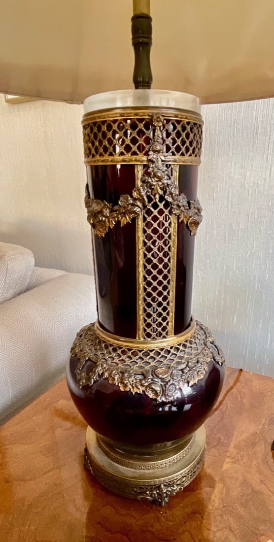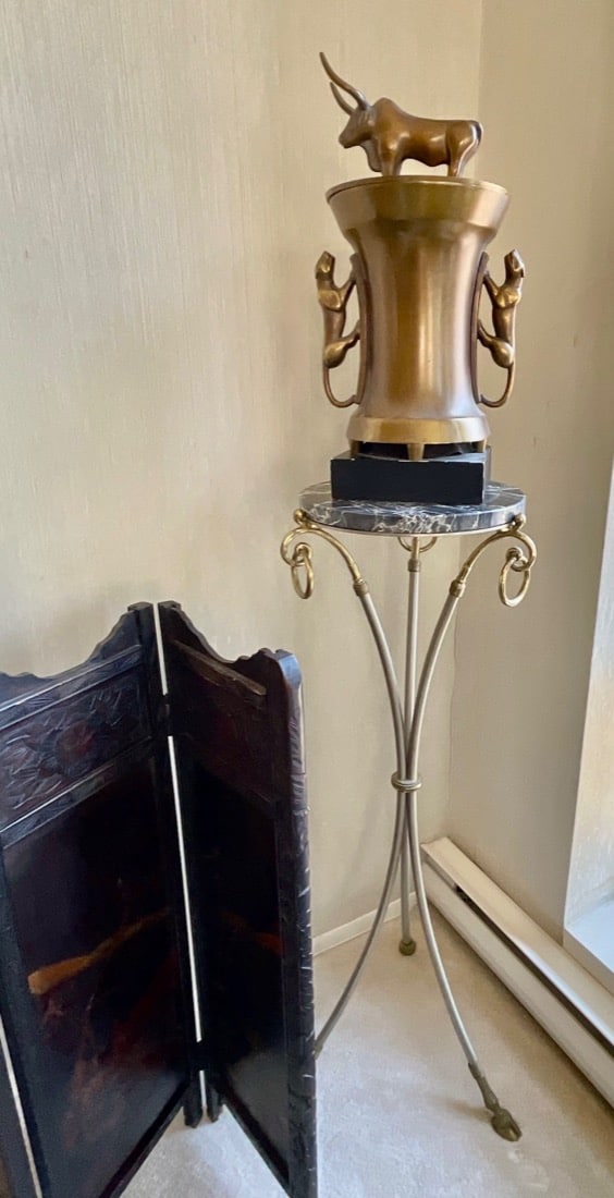 Decorative bronze-toned sculpture featuring a bull atop a metallic vessel flanked by panther-like figures, set on a marble base – Chinese antique cast bronze HU vessel, Vintage Crystal chandeliers, Lamps, Late 20th Century. Oxblood red glass, gilt lamp, standing and table lamps, Chinese porcelain, Persian Kashan style rug, Antique horned Swiss style sled,