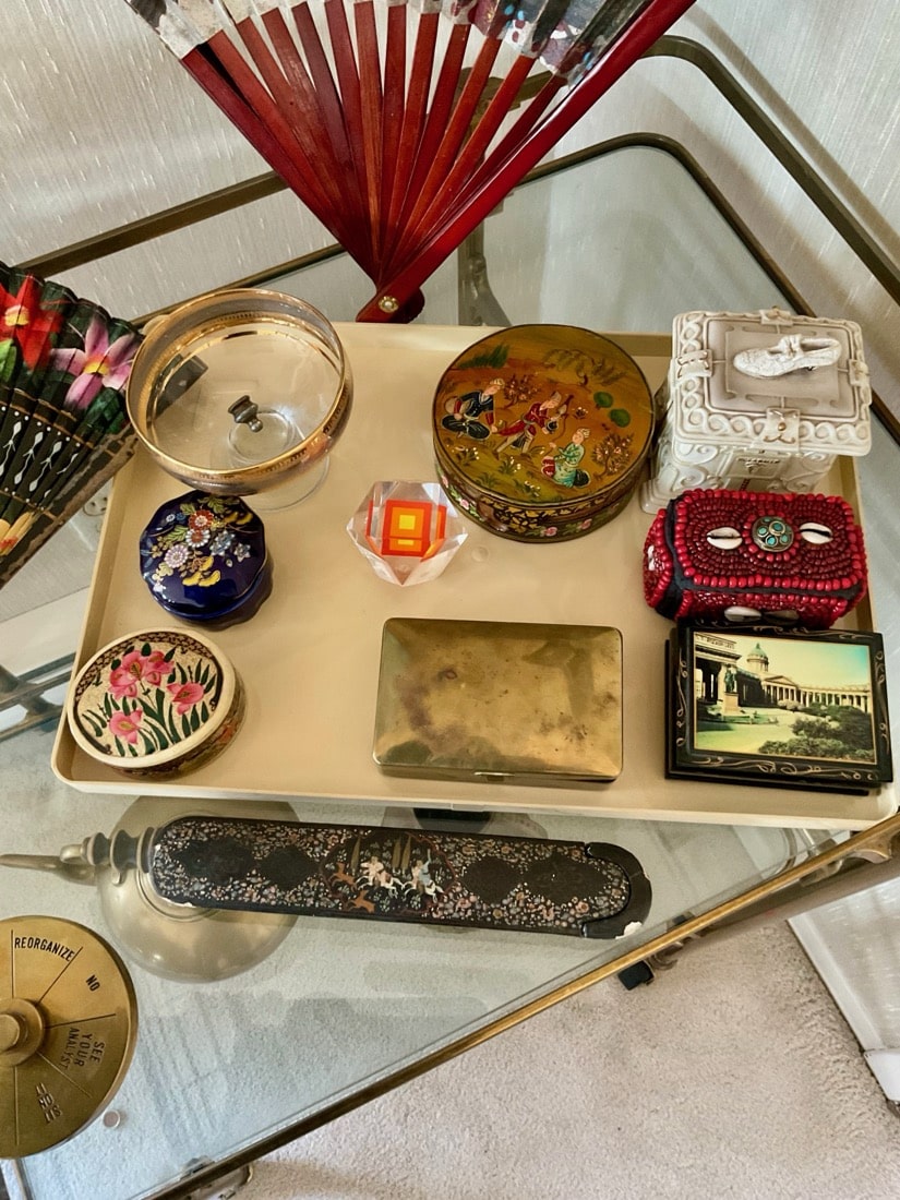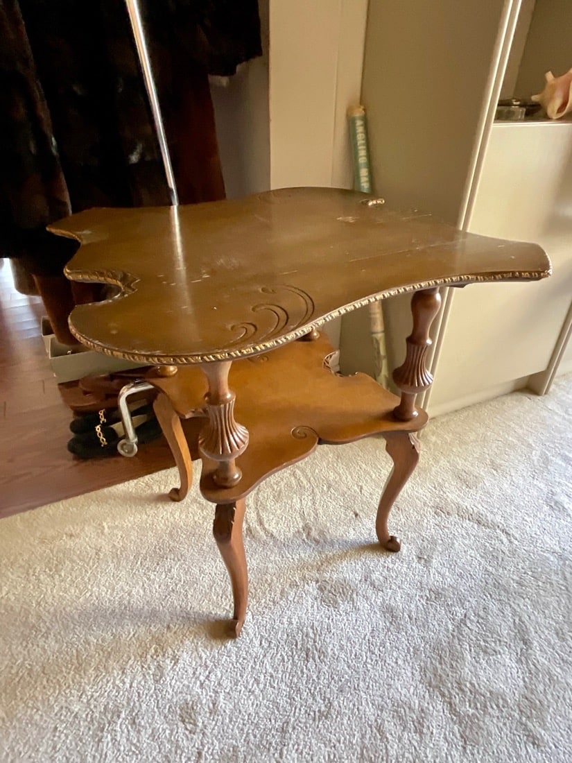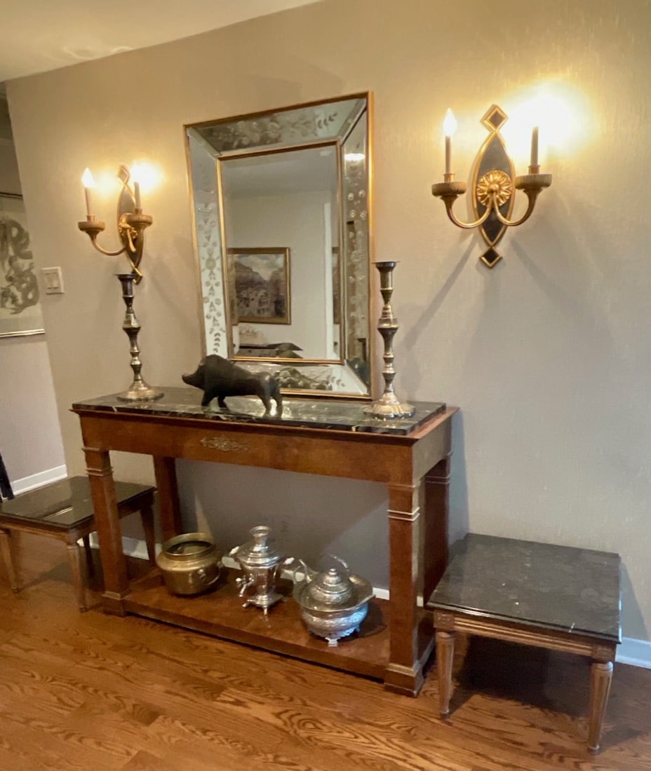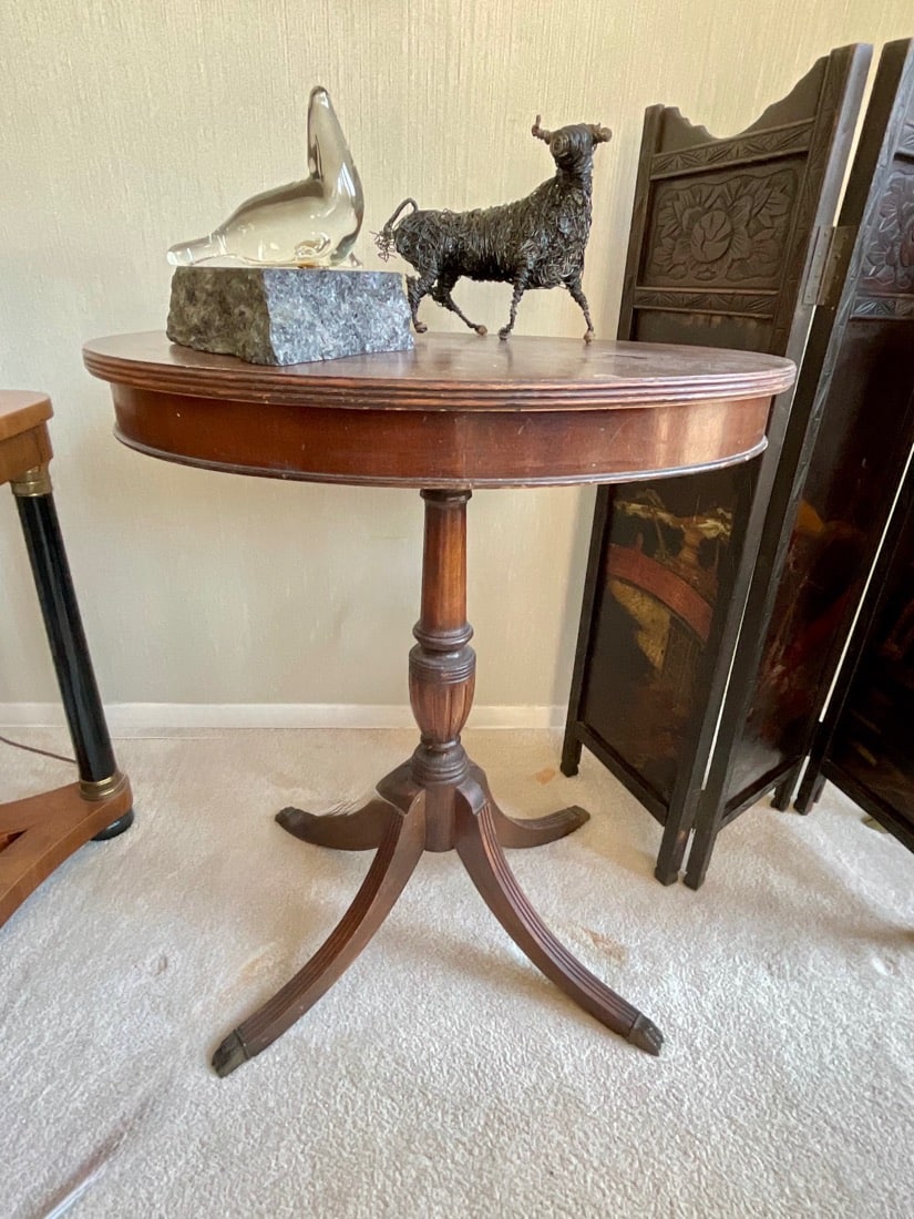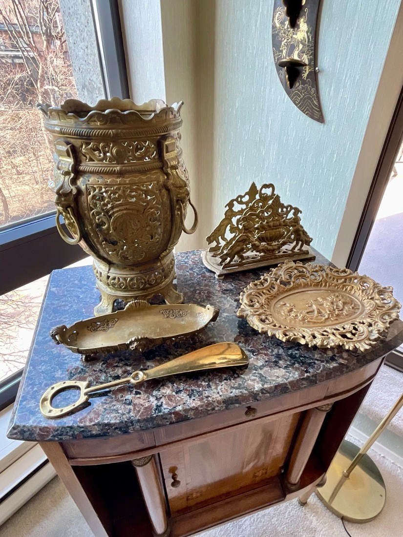 Vintage Maxwell Phillips uniquely designed mid century solid brass Bar cart, 1970’s Neoclassical design oval wooden Dining table, 6 high back Dining chairs have tall, arched backs and are partially upholstered in a patterned fabric, turned and tapered legs. Japanese inspired side table with UKIYO-E print design, Mahogany Painters Palette parlor table c.1900