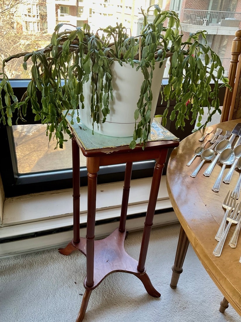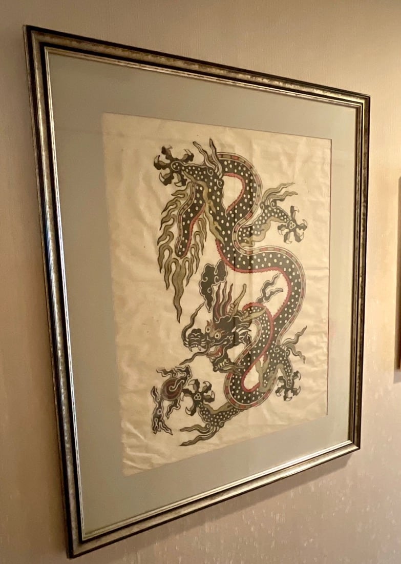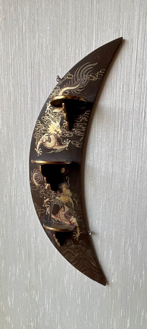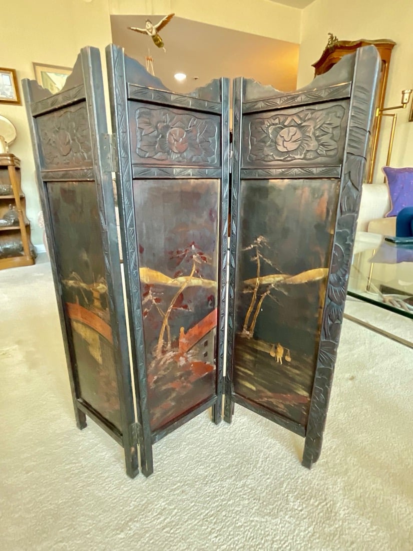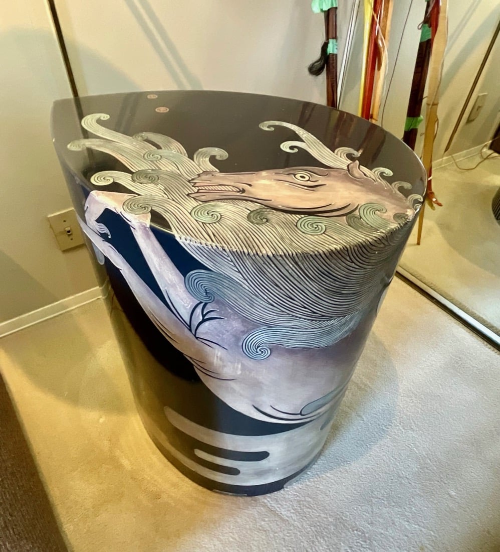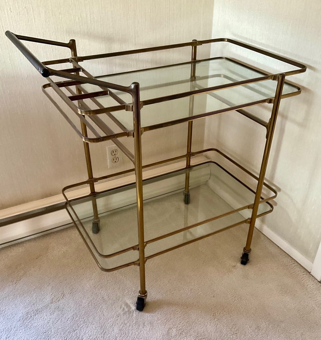 Vintage Maxwell Phillips uniquely designed mid century solid brass Bar cart, 1970’s Neoclassical design oval wooden Dining table, 6 high back Dining chairs have tall, arched backs and are partially upholstered in a patterned fabric, turned and tapered legs. Japanese inspired side table with UKIYO-E print design, Mahogany Painters Palette parlor table c.1900