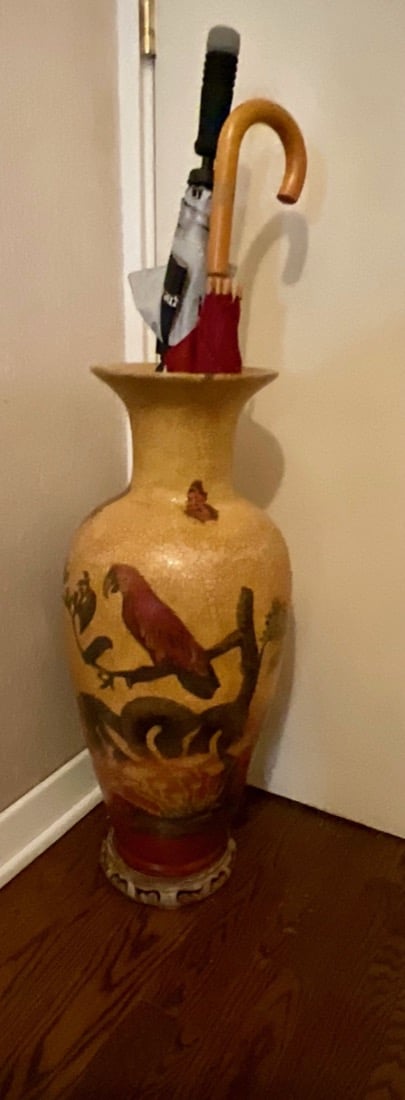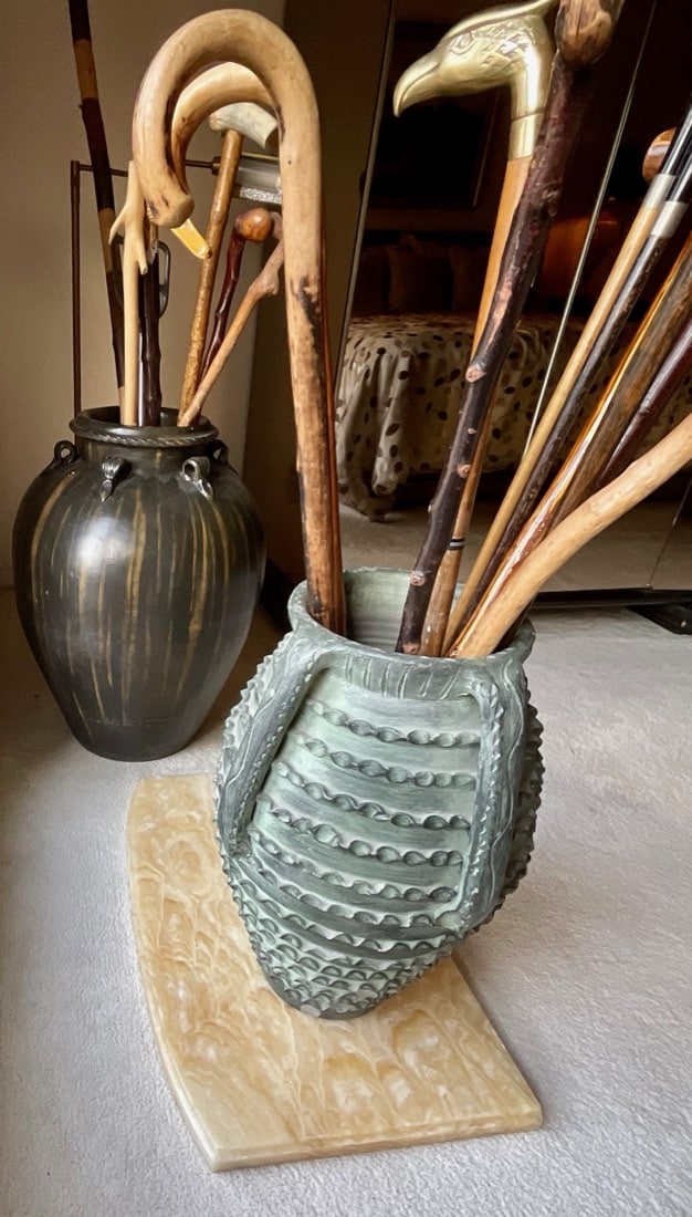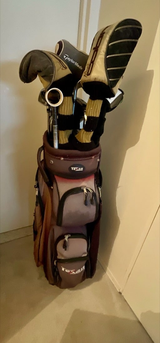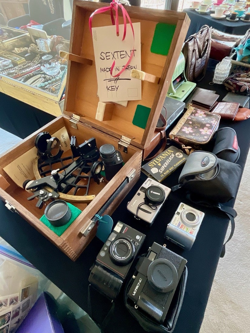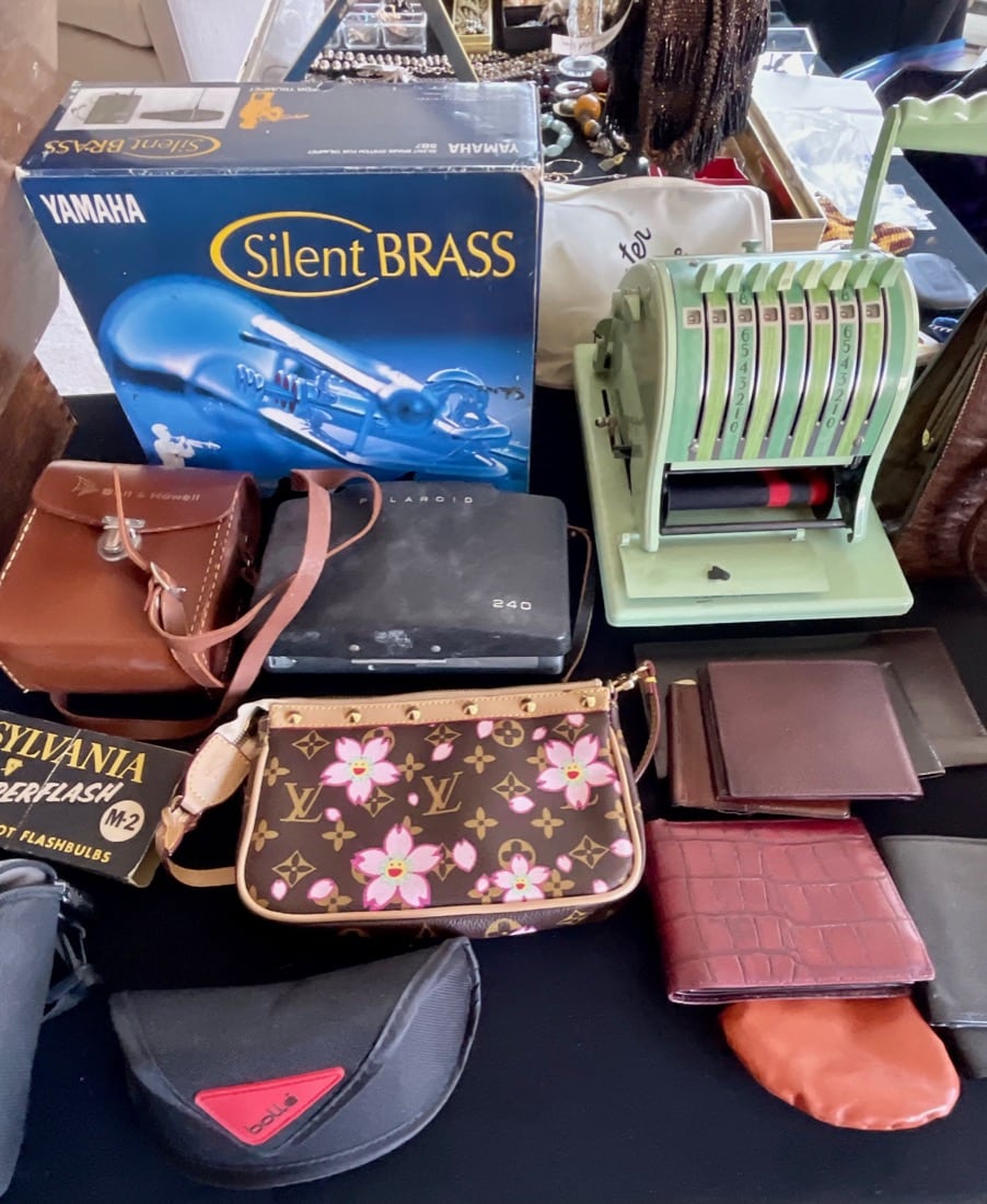 Books, Cameras, Picture frames, Decorative boxes, Tablecloths, Computer, printer, masks, folk art, small appliances, stamps, coins, sterling coins, vintage goalie stick, vintage Playboy key. Golf clubs, portable wheelchair, few vintage handbags, large pottery jugs, antique decorative brassware, Horns,